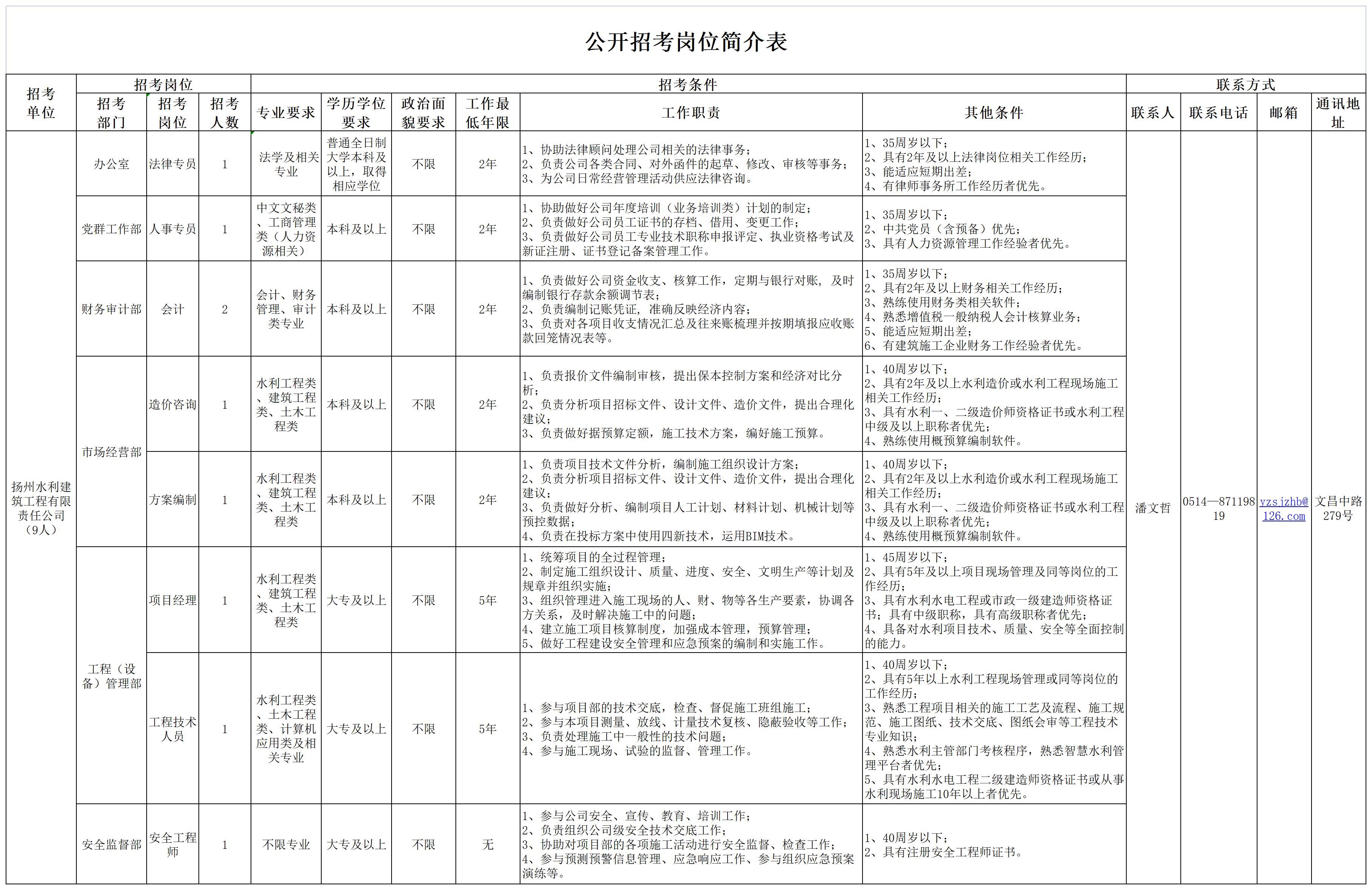為進(jìn)一步加強(qiáng)公司人才隊(duì)伍建設(shè),優(yōu)化人員結(jié)構(gòu),滿足公司生產(chǎn)經(jīng)營及建設(shè)施工的需要,結(jié)合公司2023年度招聘工作計劃,揚(yáng)州水利建筑工程有限責(zé)任公司決定面向社會公開招聘工作人員?,F(xiàn)將有關(guān)事項(xiàng)公告如下: